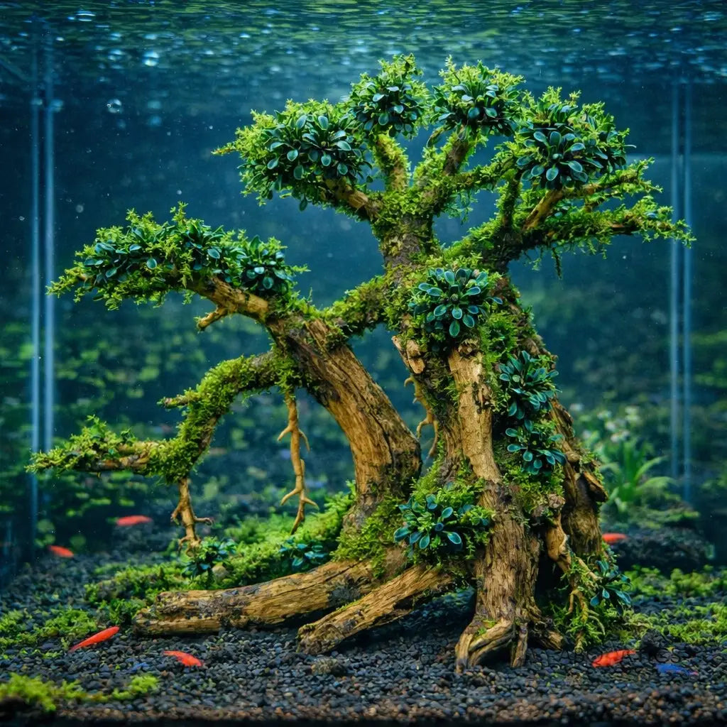 You are purchasing the bare bonsai wood structure only. Any moss, Bucephalandra, plants, or livestock shown are not included and are for aquascaping inspiration only.