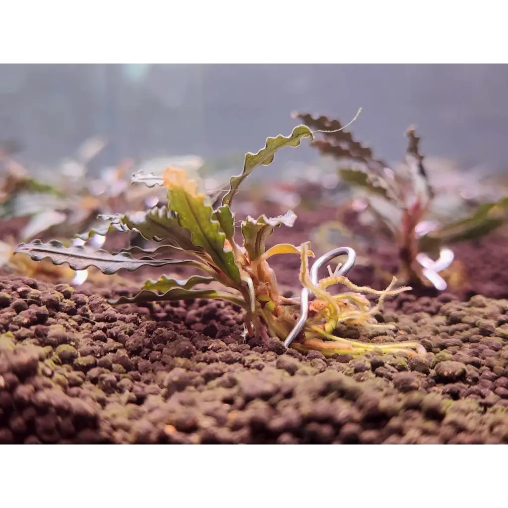 Green leafy aquatic plant with serrated edges, soil substrate.
