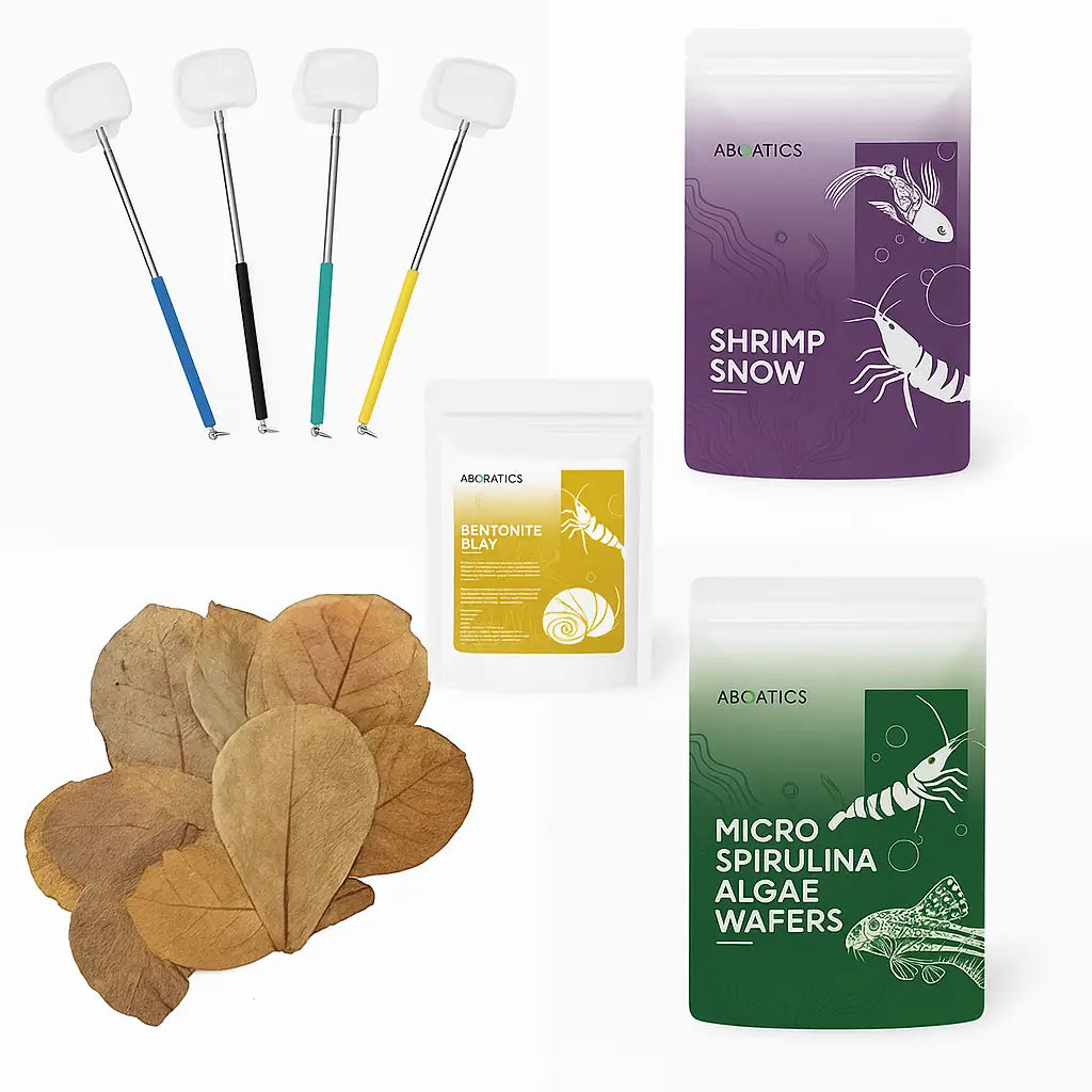 - Indian Almond Leaves: Known for their beneficial properties, these leaves aid in creating a natural habitat for your shrimp. You will receive 10x indian almond leaves.
