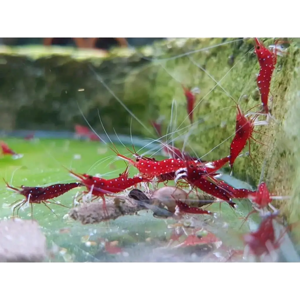 Red shrimp aquarium decor set with white antennae and black spots, durable plastic material.