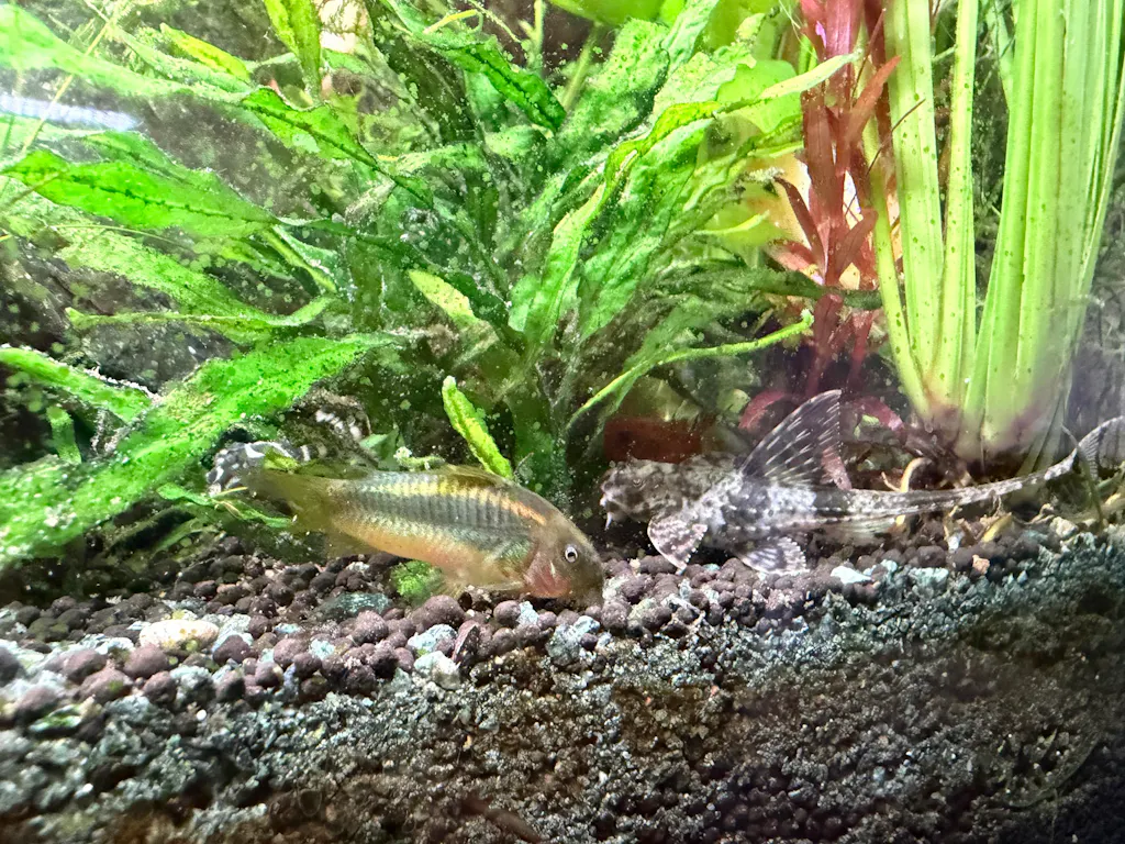 The pygmy corydoras is a silver-colored fish, with an unbroken black line that runs horizontally along the center of the sides of the fish from the tip of its snout to its caudal peduncle. It has a second thin black line along the lower part of the side of the body, from behind the ventral fins and continuing into the tail. The top part of the body has a light black or dark gray shading that starts on the top of its snout and ends at the tail.Newly hatched fry have vertical stripes along the sides of their bodies that fade by the end of their first month, when the horizontal stripes of the adult fish begin to appear.
